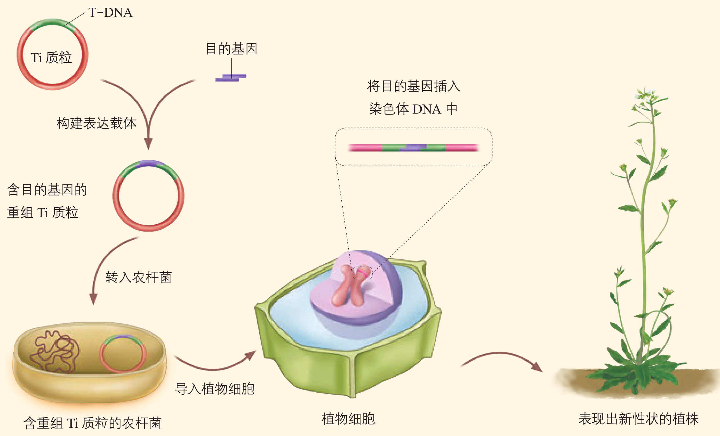 农杆菌是一种在土壤中生活的微生物,能在自然条件下侵染双子叶植物和裸子植物,而对大多数单子叶植物没有侵染能力。农杆菌细胞内含有 Ti 质粒,当它侵染植物细胞后,能将 Ti 质粒上的 T-DNA(可转移的 DNA)转移到被侵染的细胞,并且将其整合到该细胞的染色体 DNA 上。根据农杆菌的这种特点,如果将目的基因插入 Ti 质粒的 T-DNA 中,通过农杆菌的转化作用,就可以使目的基因进入植物细胞。