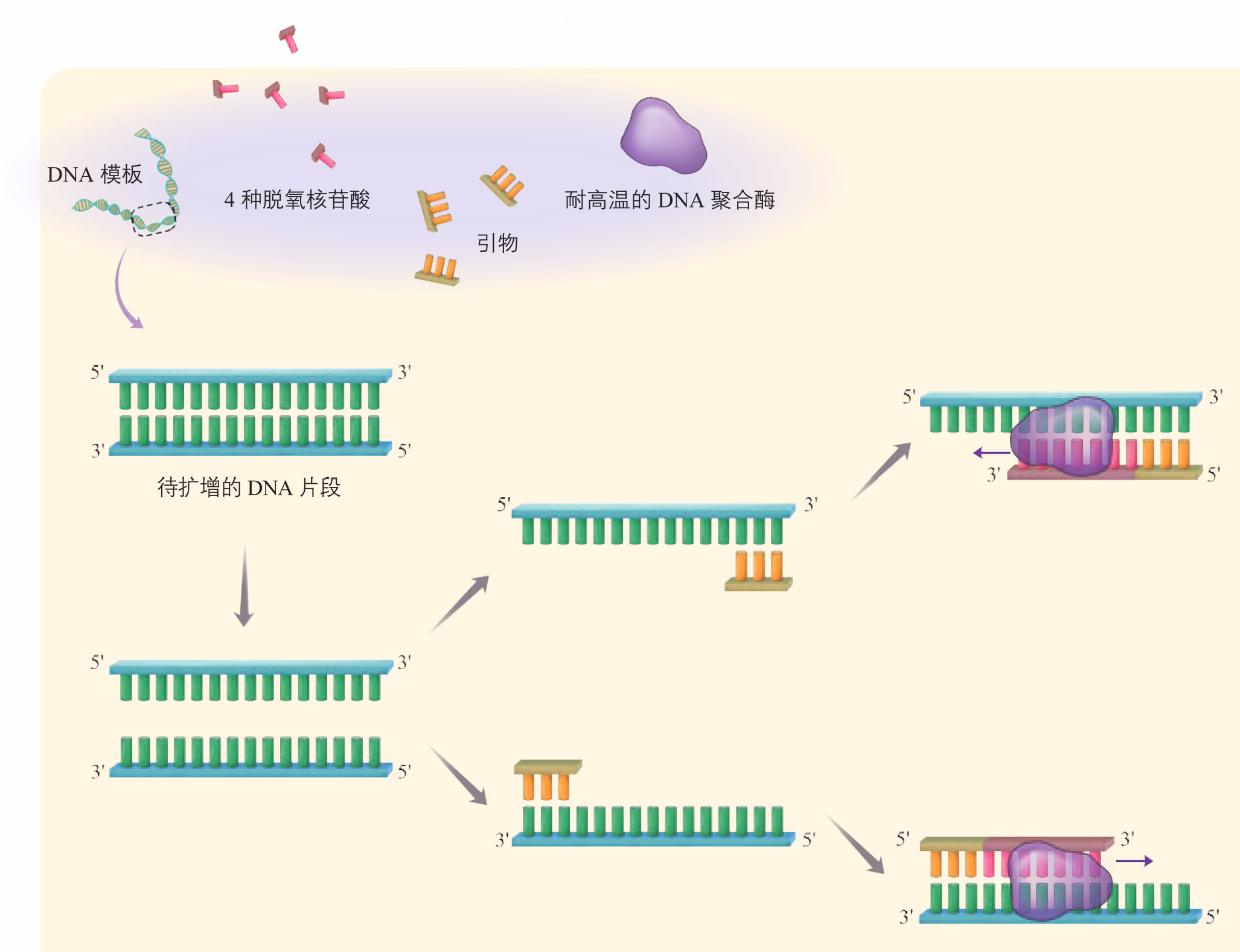 延伸 当温度上升到 72 ℃左右时,溶液中的 4 种脱氧核苷酸在耐高温的 DNA 聚合酶的作用下,根据碱基互补配对原则合成新的 DNA 链。
