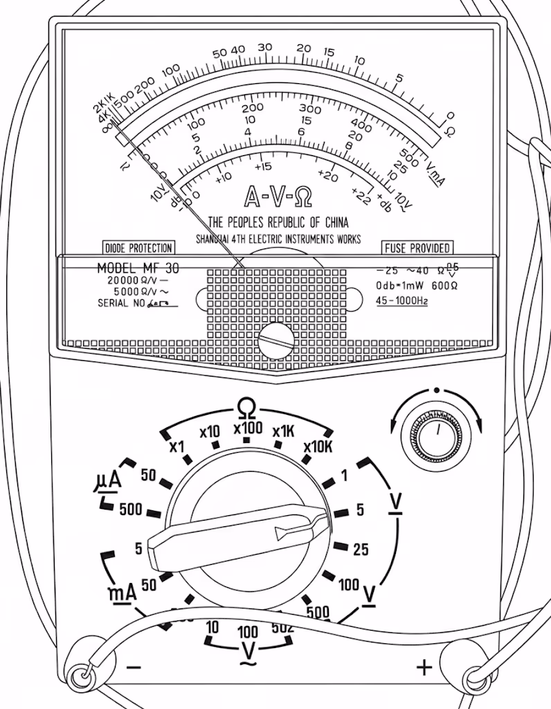 多用电表,又称万用电表、多用表、多用计、万用表、万用计,俗称三用电表,一般包含电流表(安培计)、电压表(伏特计)、电阻表(欧姆计)等功能。一个老式的多用电表(上海第四仪表厂)如图所示: