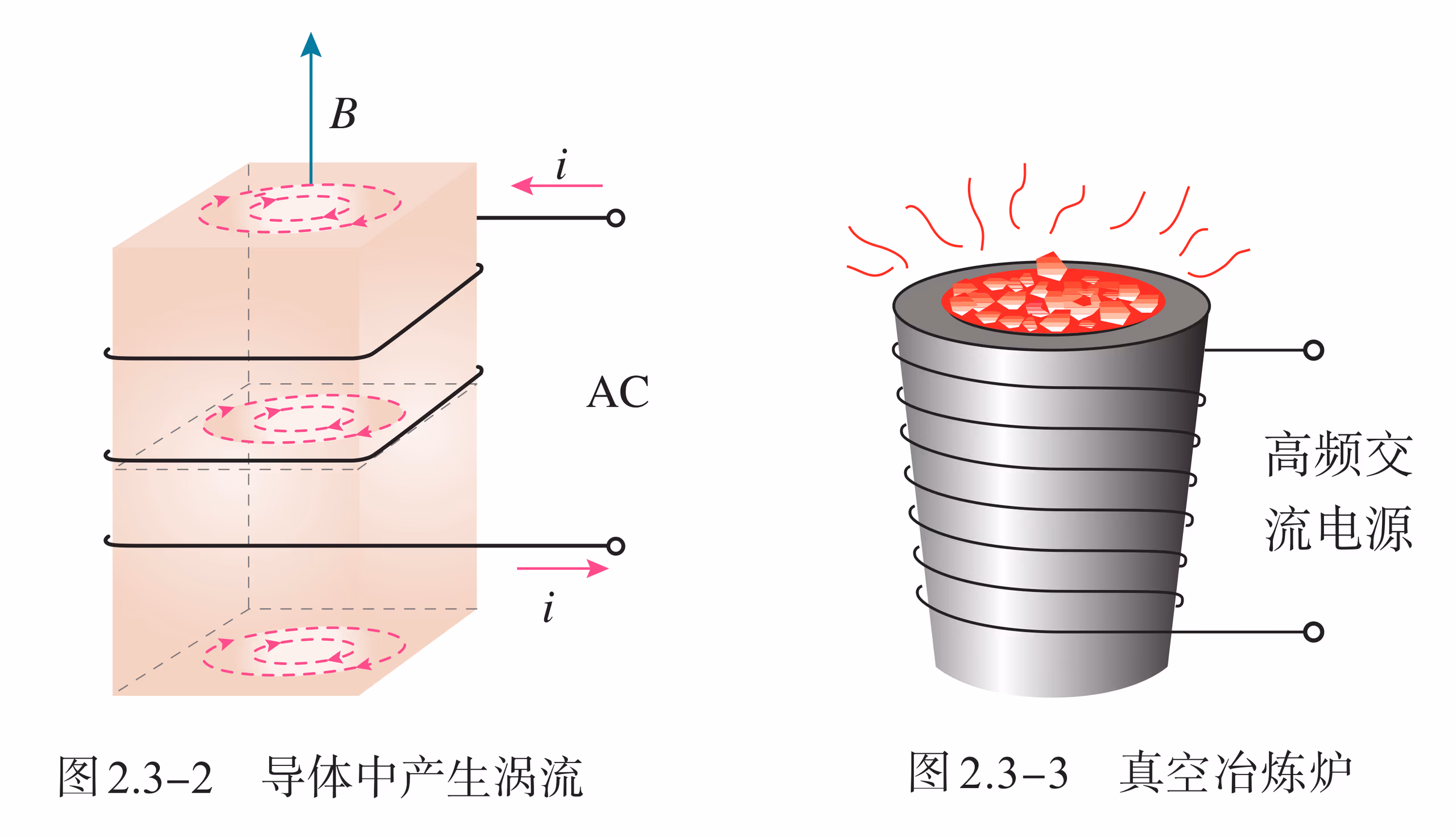 金属块中的涡流会产生热量。用来冶炼合金钢的真空冶炼炉,炉外有线圈,线圈中通入迅速变化的电流,炉内的金属中产生涡流。涡流产生的热量使金属熔化。利用涡流冶炼金属的优点是,整个过程可以在真空中进行,能防止空气中的杂质进入金属,可以冶炼高质量的合金。同理,电磁炉的加热原理是,迅速变化的电流通过电磁炉面板下方的线圈时,线圈周围产生迅速变化的磁场,变化的磁场使面板上方的铁锅底部产生涡流,铁锅迅速发热,从而达到加热食物的目的。