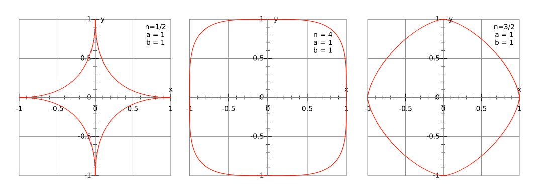∣ x a ∣ n + ∣ y b ∣ n = 1 \vert{\dfrac{x}{a}}^n+\vert{\dfrac{y}{b}}^n=1 a x n + b y n = 1 其中 a , b , n a, b, n a , b , n 为正数。上述方程式的解是一个在 − a ≤ x ≤ a -a \le x \le a − a ≤ x ≤ a 及 − b ≤ y ≤ b -b \le y \le b − b ≤ y ≤ b 矩形内的封闭曲线,参数 a a a 及 b b b 称为曲线的半直径。