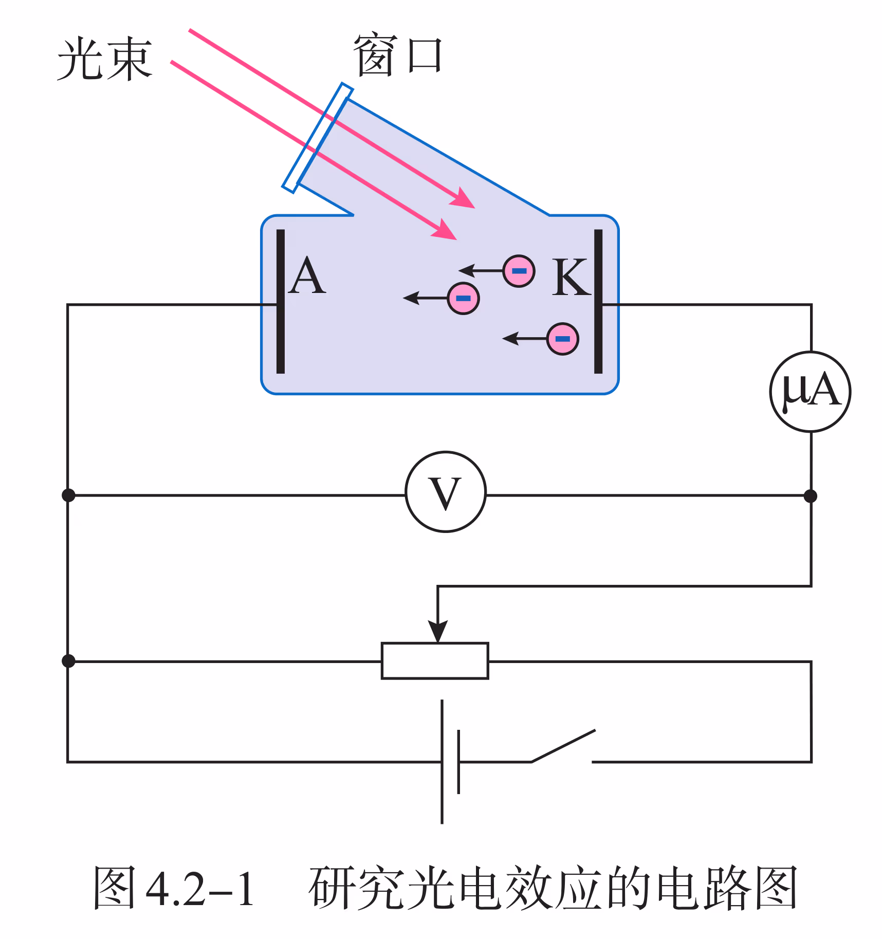 阴极 K 和阳极 A 是密封在真空玻璃管中的两个电极,阴极 K 在受到光照时能够发射光电子,在两极板电压 产生的电场的作用下,向左移动。