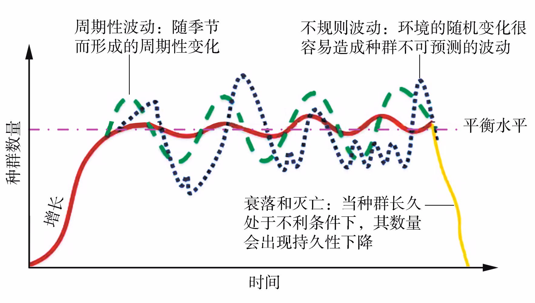 可看出,某种群数量随着某一关键性因子的变化而变化。在关键性因子最适区,生物最多;当关键性因子偏离最适区,生物不断减少;当关键性因子超过生物耐受范围时,生物将面临生存困难乃至死亡。任何生物的种群数量都会随着关键性因子的变化而发生有规律的变化。对于种群来说,除了某些关键性因子外,还会受到其他环境因子的影响。