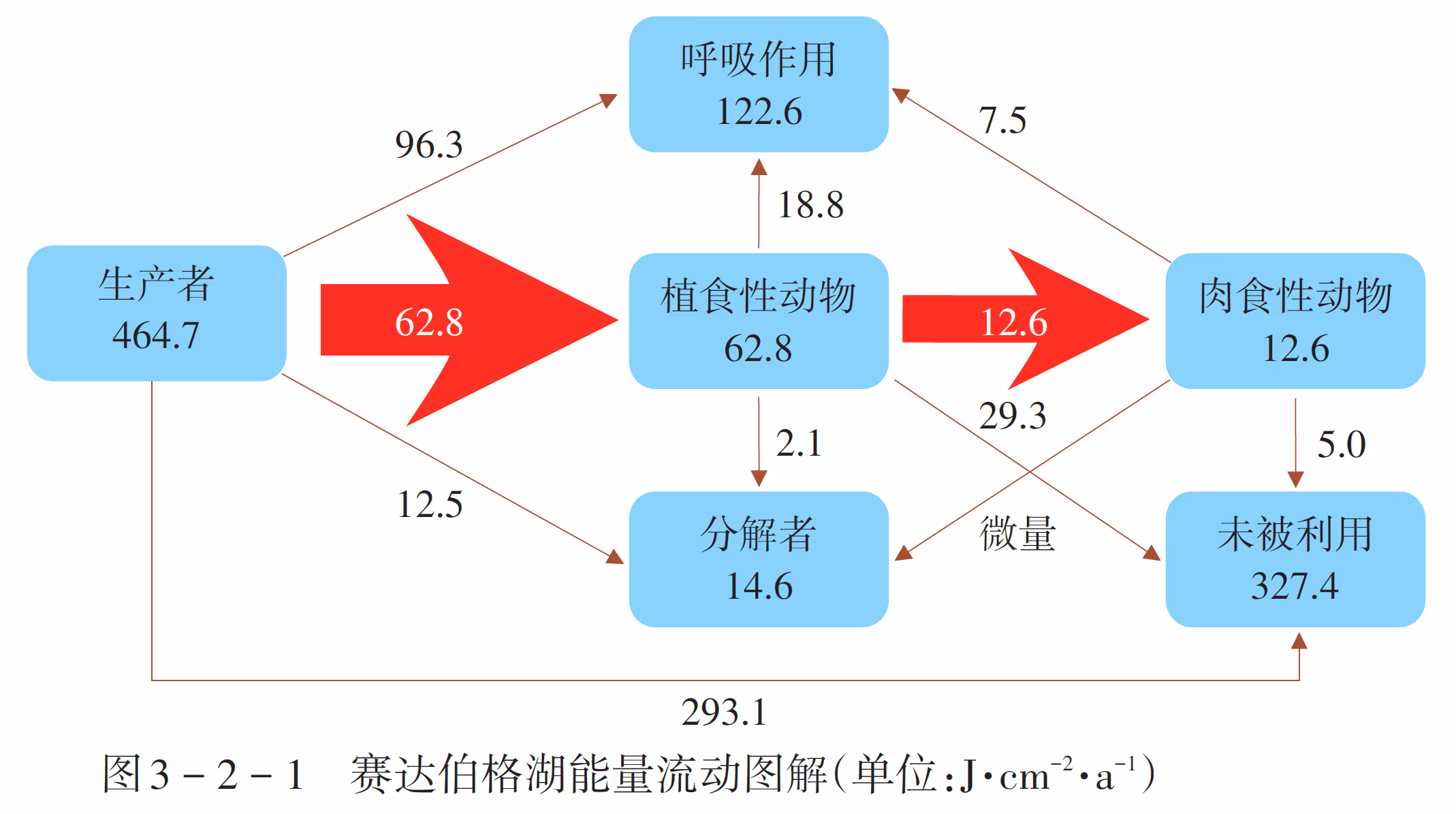 20 世纪 30 年代末,美国生态学家林德曼对赛达伯格湖进行了开创性的研究工作。在取得大量数据的基础上,绘制了赛达伯格湖中能量流动的图解,如上图所示。从赛达伯格湖的能量流动图解可以发现,生产者固定的太阳能并没有全部流入植食性动物,流入植食性动物的能量也有多个去向,因此肉食性动物只获得了流入植食性动物的部分能量。