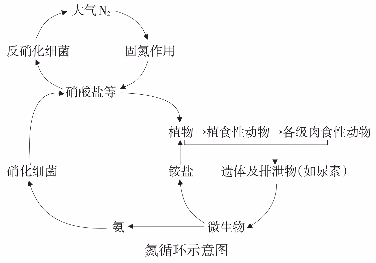 地壳中的氮元素主要以大气中的氮气和土壤中的硝酸盐等形式存在。氮循环是指生物圈中氮气与含氮化合物之间相互转换的过程。氮循环是生态系统中最重要的物质循环之一。大气中的氮气大约占大气体积的 。通过固氮作用(如生物固氮、工业固氮和光电固氮),大气中游离的氮可以转变为硝酸盐等无机含氮化合物,从而被植物吸收利用。沿着食物链(网),植物中的有机含氮化合物被各营养级的生物同化利用。动物体内的部分蛋白质在代谢中生成尿素等含氮化合物。尿素在土壤中可以被植物直接吸收,但更多的是被土壤微生物转化为可以被植物吸收利用的铵盐。动植物的遗体等经微生物的分解作用形成氨,氨可以被硝化细菌进一步氧化成为硝酸盐。硝酸盐能被反硝化细菌等逐步转化为氮气,进而返回大气。