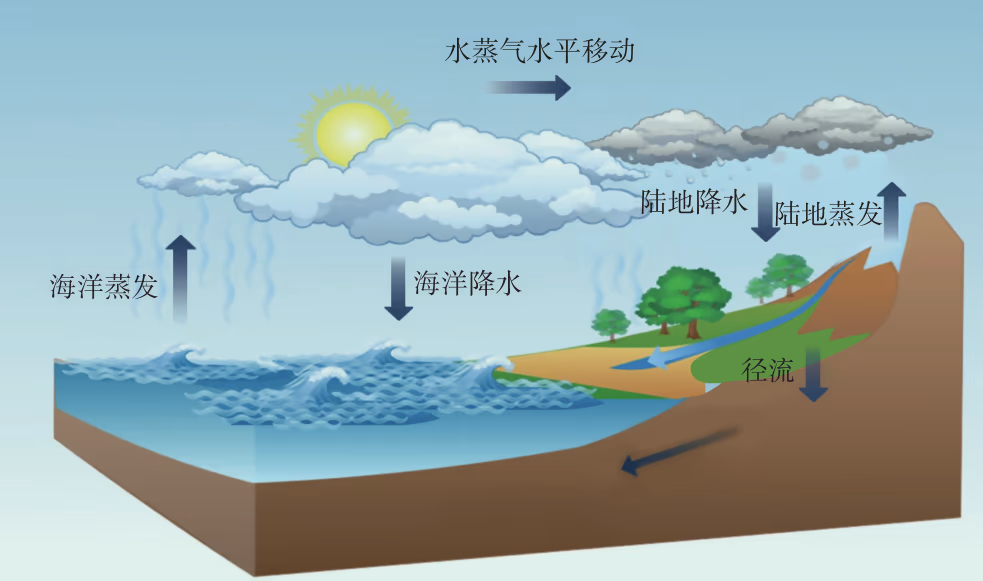 水从地球表面通过蒸发进入大气圈,同时又不断从大气圈通过降水而回到地球表面。每年地球表面的蒸发量和全球降水量基本相等,因此这两个相反的过程就达到了一种平衡状态。