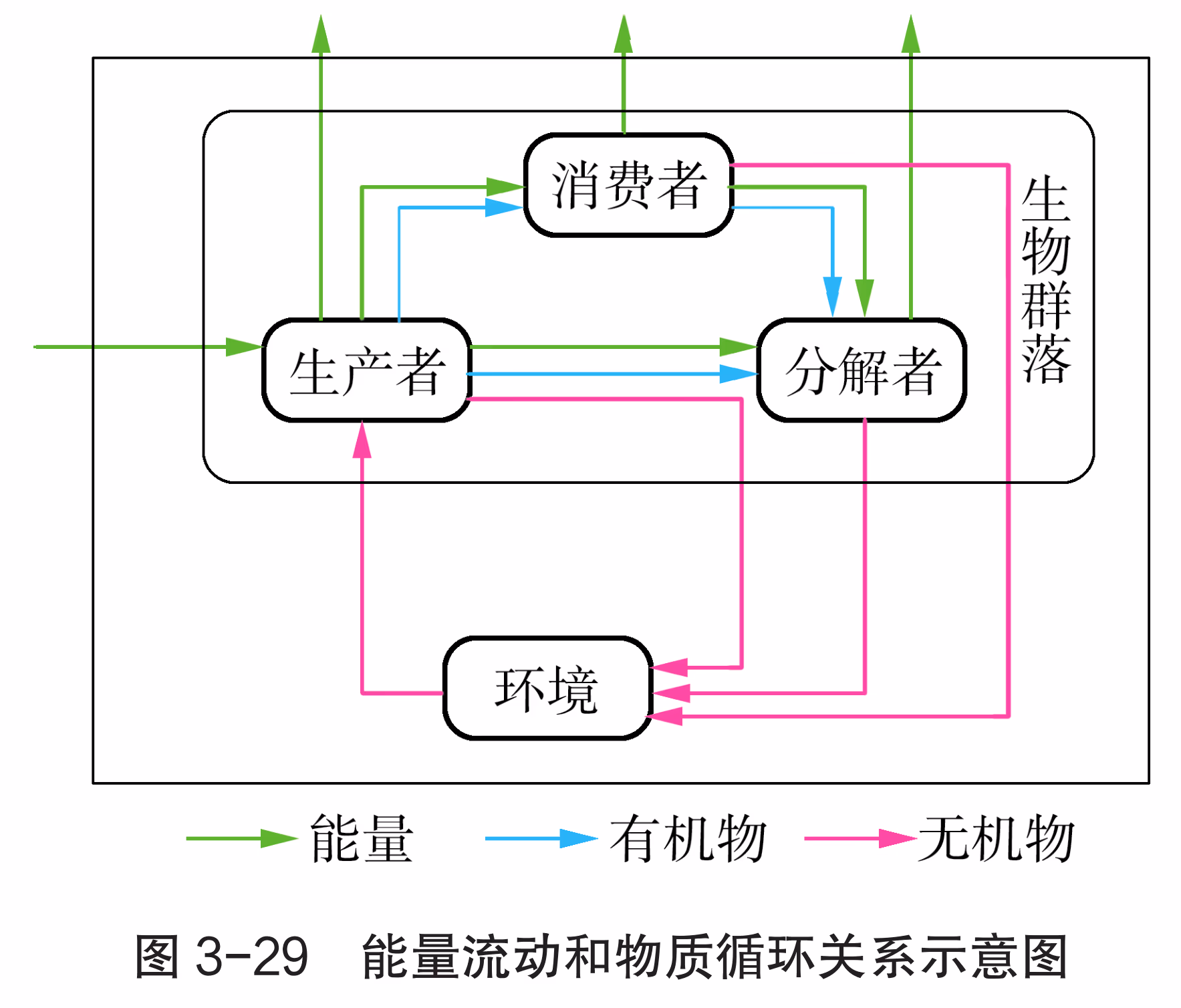 生态系统中循环着的物质既是储存能量的载体,又是维持生命活动的基础。物质的循环过程,是物质由简单的无机物到复杂的有机物,再回到简单无机物的再生过程,同时也是生态系统的能量输入、传递、转化和散失的过程。物质通过合成与分解的不断循环,执行着生态系统的能量流动、信息传递等的载体功能。能量作为动力,能够促进物质的循环,物质循环一旦不畅,就会产生诸多环境问题。能量流动和物质循环是生态系统中的两个基本过程,它们将生态系统的各种成分联结成为一个统一的整体