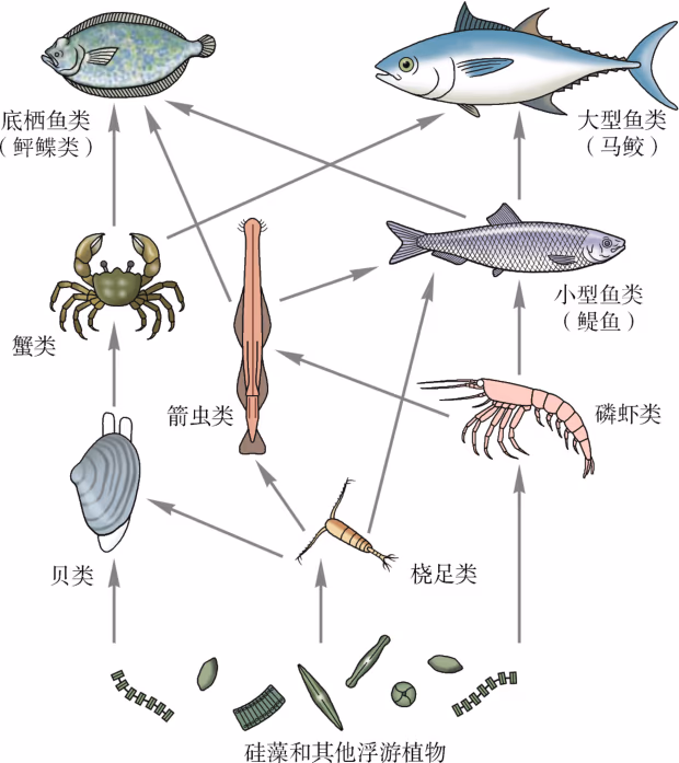 生产者与消费者可以通过食物关系相互联系起来,它们通过捕食与被捕食的关系排列成一定的序列。1927 年英国生态学家埃尔顿首次提出了食物链的概念:食物链是各种生物之间由于食物关系而形成的一种联系。在自然环境中,食物链可以反映出一个生态系统中各种生物之间的直接和间接的食物关系。上述食物链仅仅是自然界中的一类通过食物关系而互相联系形成的捕食食物链。此外,还有碎屑食物链(腐生食物链)和寄生食物链等。