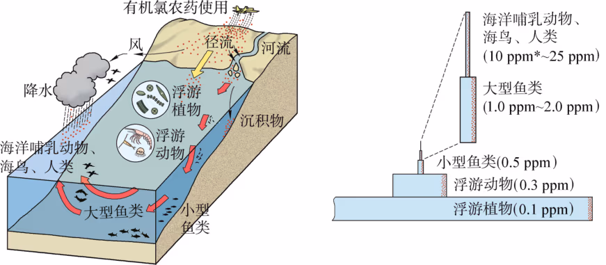 DDT 即双对氯苯基三氯乙烷,是一种人工合成的有机氯杀虫剂,它的问世对农业发展曾起到了很大的推动作用。DDT 的使用让棉花等农作物因免遭虫害而大幅度提高了产量。此外,DDT 对蚊子、苍蝇、虱子等有毒性,它的使用很好地控制了由这些生物传播的疟疾以及其他致命性疾病的扩散。它不易分解,易溶于脂肪并积累在动物脂肪中。DDT 在生态系统中的富集不仅影响生物的生存与发展,而且给人类的健康也带来威胁。例如,在草原生态系统中,人们曾对牧草喷洒 DDT,含有 DDT 的牧草被羊、牛、马等植食性动物摄入,并在它们体内富集,人类食用这些动物的肉、奶后,DDT 便进入人体并逐渐富集。DDT 进入人体或动物体后,容易积累在人或动物脂肪组织中,并可能形成积累性中毒。因此,许多国家现在已禁止使用 DDT。