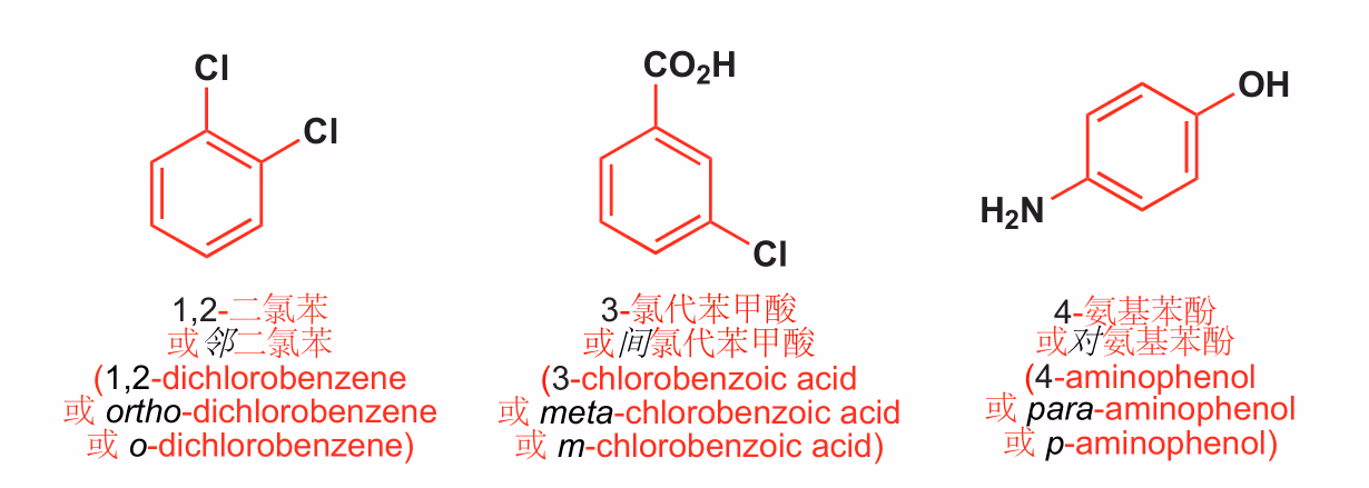 - 邻、间、对: 对于二取代苯,常用汉字“邻、间、对”或字母 o/m/p 来代替数字编号。
