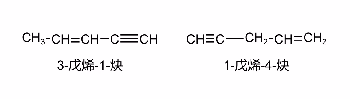若分子中同时含有碳碳双键与碳碳三键,可用某烯炔作结尾,并给予双键、三键尽可能低的位号,如果位号有选择时,使双键位号比三键小,书写时先烯后炔。