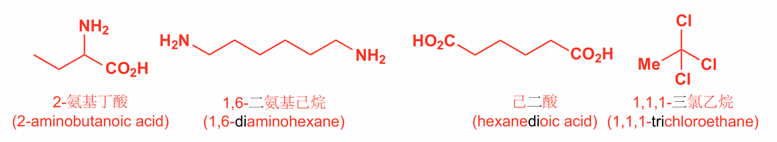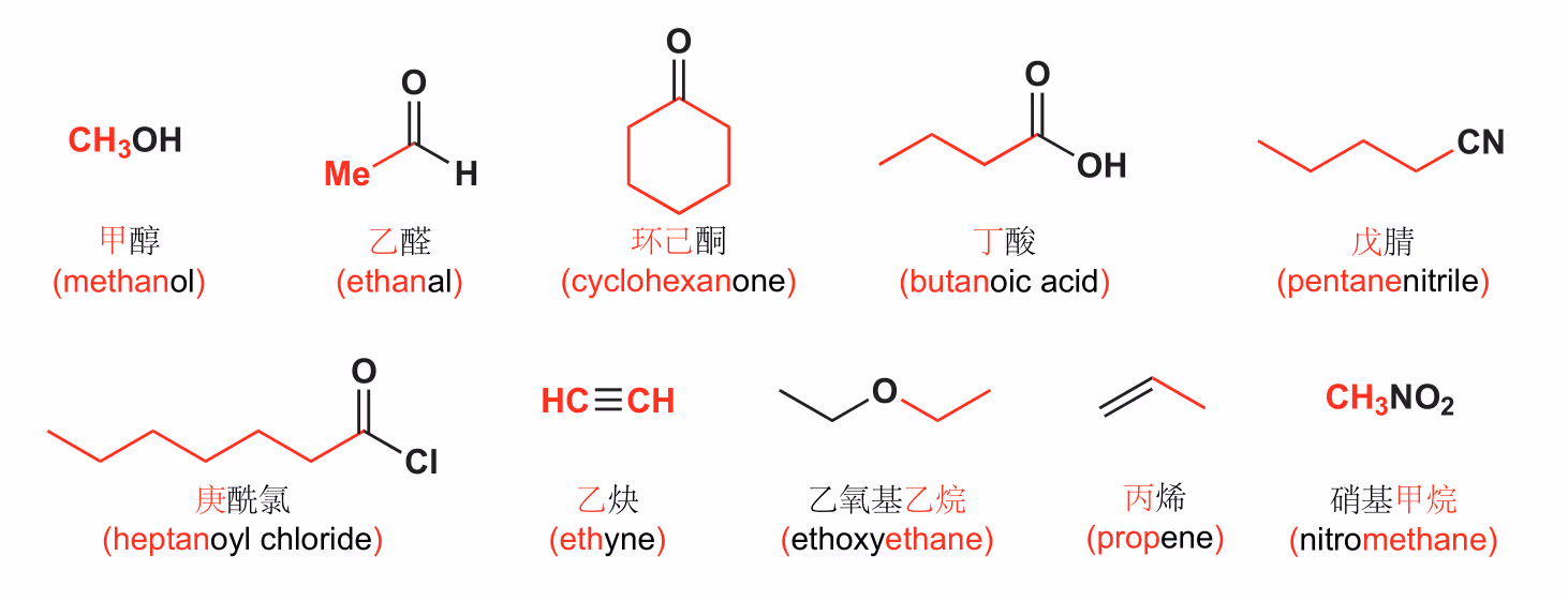 将含有官能团的最长主链作为母体化合物:将含有母体官能团的最长碳链作为主链,将支链作为取代基,根据主链的碳原子数称为某醇、醛、酮、酸、酰卤、酰胺、腈等。