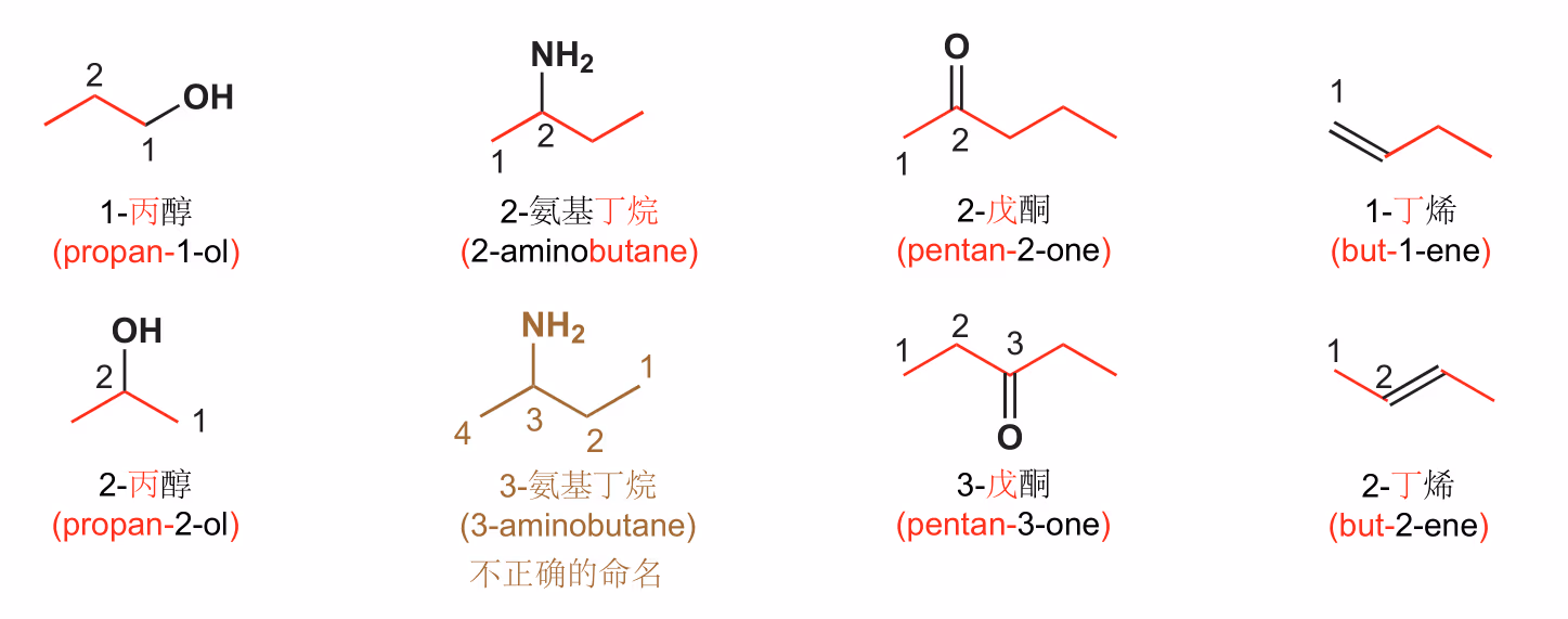 系统名称可以分为三个部分:其一描述了碳氢骨架,其二描述了官能团,还有一个阐释了官能团在碳氢骨架上的位置。