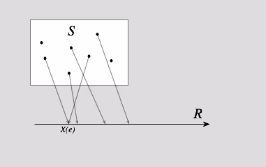 随机函数是一个特殊的实函数,对于任意 e ∈ S e\in S e ∈ S ,都有唯一一个对应 X ( e ) X(e) X ( e ) ,如图。