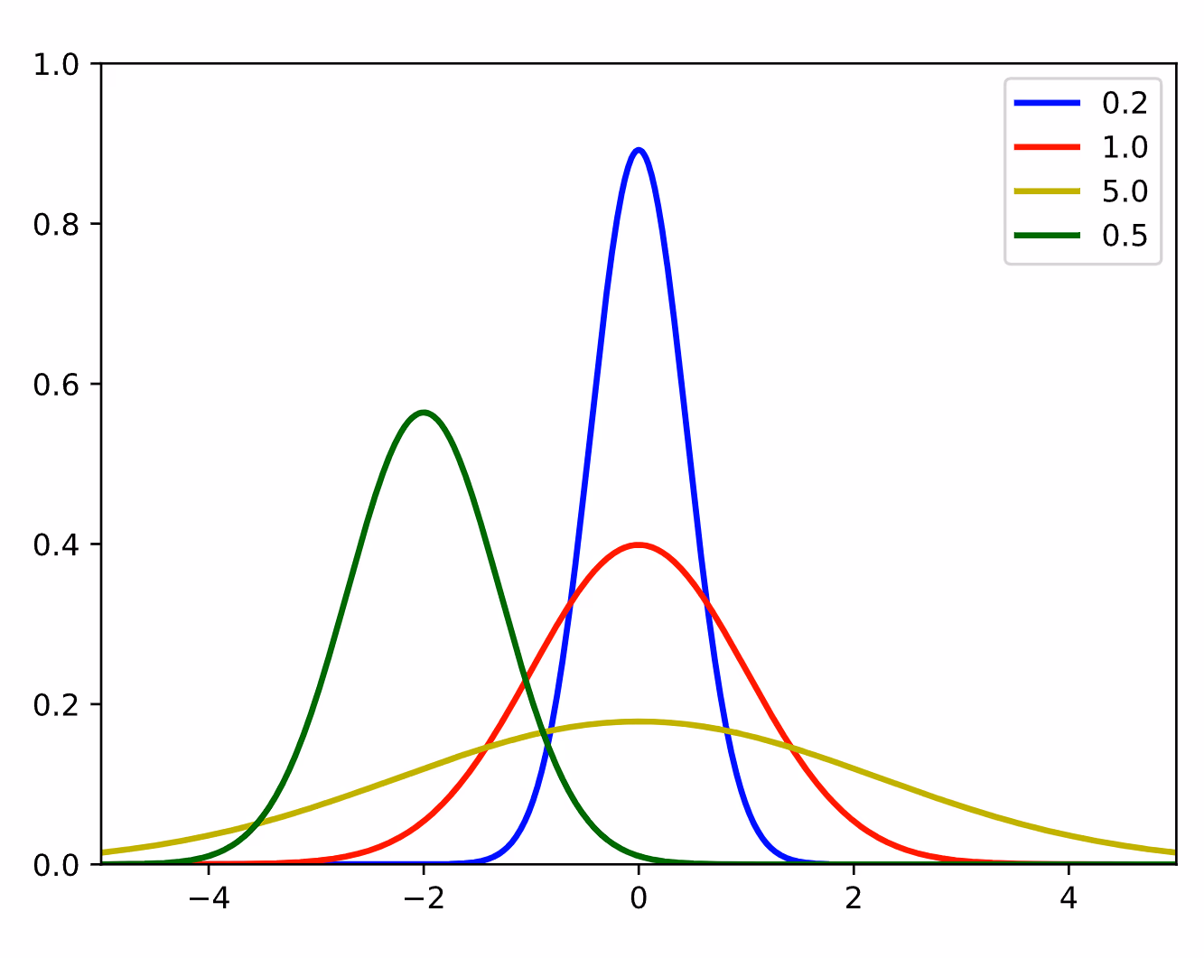 正态分布的概率密度函数中以平均值 μ \mu μ 、标准差 σ \sigma σ 为参数,正态分布的数学期望值或期望 μ \mu μ ,可解释为位置参数,决定了分布的位置;其方差 σ 2 \sigma ^{2} σ 2 的平方根或标准差 σ \sigma σ 可解释尺度参数,决定了分布的幅度。