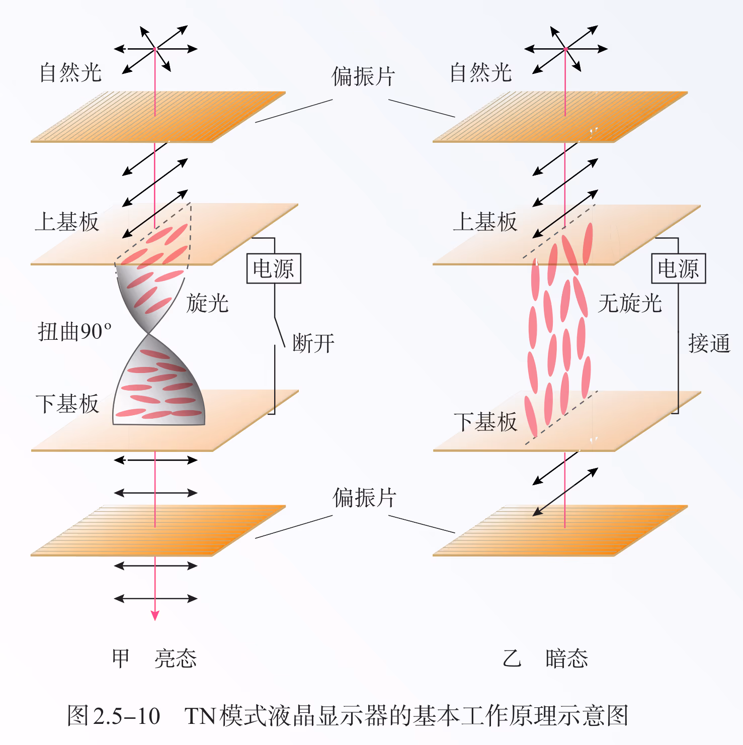 液晶显示:某种液晶分子取向可沿轴旋转,形成连续扭曲状态,TN 模式显示器里用的就是这种液晶。扭曲排列的液晶分子具有旋光性,即光的偏振方向沿液晶的排列方向旋转。上、下基板外侧附着两片透光轴互相垂直的偏振片,上侧的偏振片透光轴与上侧基板处的液晶取向平行,下侧的偏振片透光轴与下侧基板处的液晶取向平行。上、下基板内侧带有透明电极。中间部分的液晶分子则连续扭曲 90° 排列。不加电场时,自然光通过第一块偏振片变为平行于上基板处液晶取向的偏振光,偏振光被液晶层旋光,转过 90° 后偏振方向正好与下基板处偏振片的透光轴相平行,光透过时呈现亮态。加电场后,原来扭曲排列的液晶分子变为垂直平行排列,液晶分子沿电场方向竖起,透过第一块偏振片的偏振光通过液晶层时不再发生旋光,到达出射端的偏振片时,透光轴与出射光的偏振方向垂直,光被截止,呈现暗态。